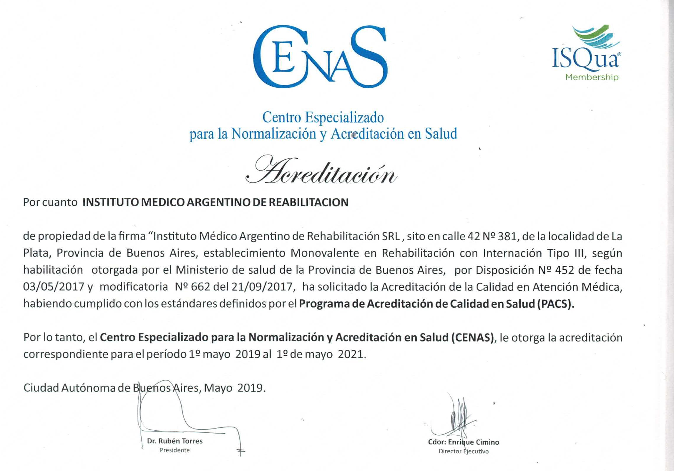 El CENAS, Centro Especializado para la Normalización y Acreditación en Salud, procedió a realizar una evaluación de cumplimiento de estándares de calidad en salud encuadrada en el Programa PACS. Nuestro instituto alcanzó la meta de cumplimiento satisfactoriamente, por lo que hemos conseguido incorporarnos al Programa de Acreditación de Calidad en Salud. PACS.